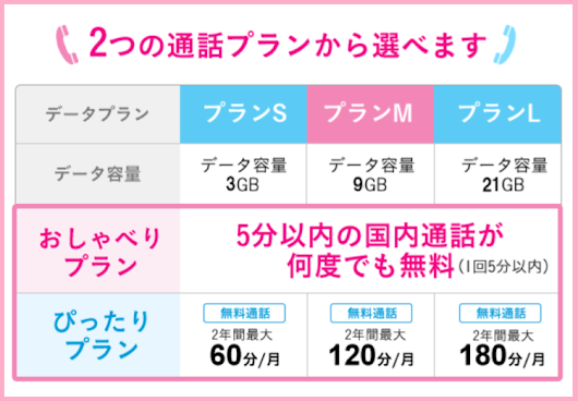 「おしゃべりプラン」では5分かけ放題、「ぴったりプラン」では無料通話がセットになっています。