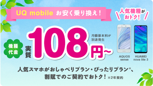 そんなわけで格安SIMはスマホを壊したら安くできない!という結論になったのですが、そこで当サイトの管理人が目を付けたのがUQモバイルの100円、500円端末です。
